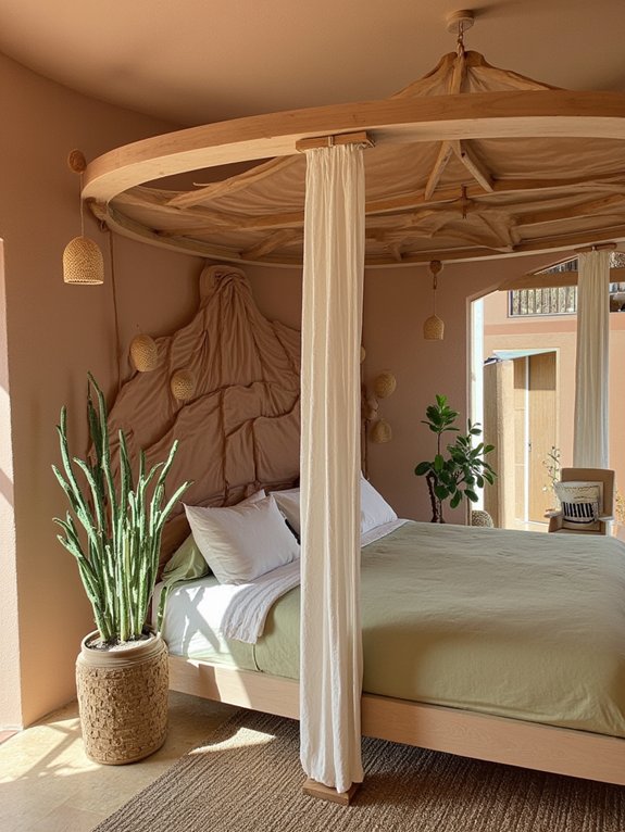 A desert clay canopy bed creates a striking focal point in the bedroom with its warm terracotta frame and architectural presence. The dramatic structure serves as both a decorative element and a cozy retreat space, while its earthy tone establishes a natural color foundation.