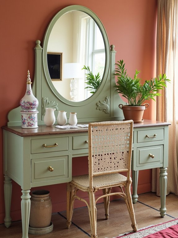 The organic green vanity table combines sophisticated design with eco-conscious materials. Its sage finish and terracotta ceramic drawer pulls create an elegant self-care station, featuring FSC-certified bamboo construction and recycled components. The piece includes three soft-close drawers and a beveled mirror framed in reclaimed teak.