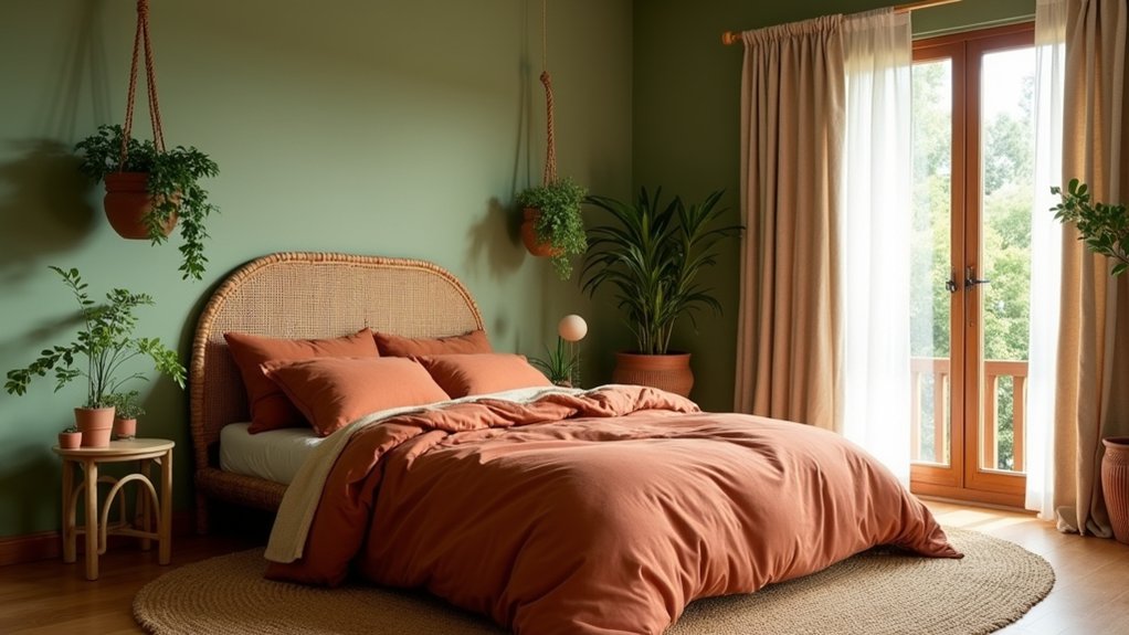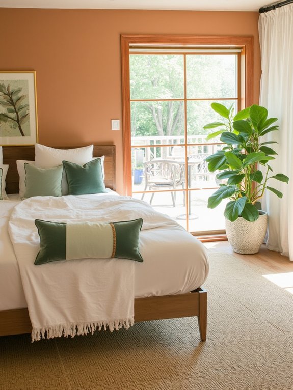 Whether through sage-colored walls complemented by clay-toned bedding, or lush plants against terracotta accent pieces, this color combination transforms bedrooms into tranquil sanctuaries.