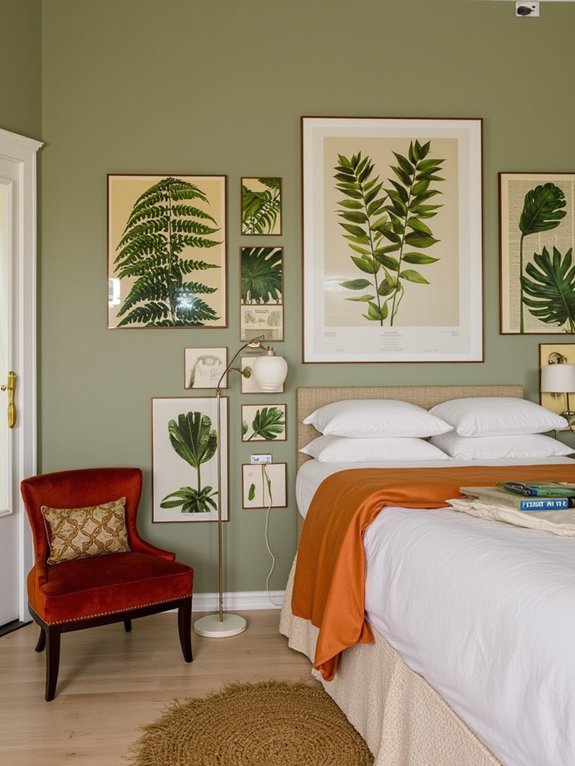 Botanical wall art in lush green tones offers a simple way to bring natural serenity into any bedroom space. From oversized fern prints to vintage plant illustrations, these nature-inspired pieces create an instant connection to the outdoors while serving as striking decorative elements.