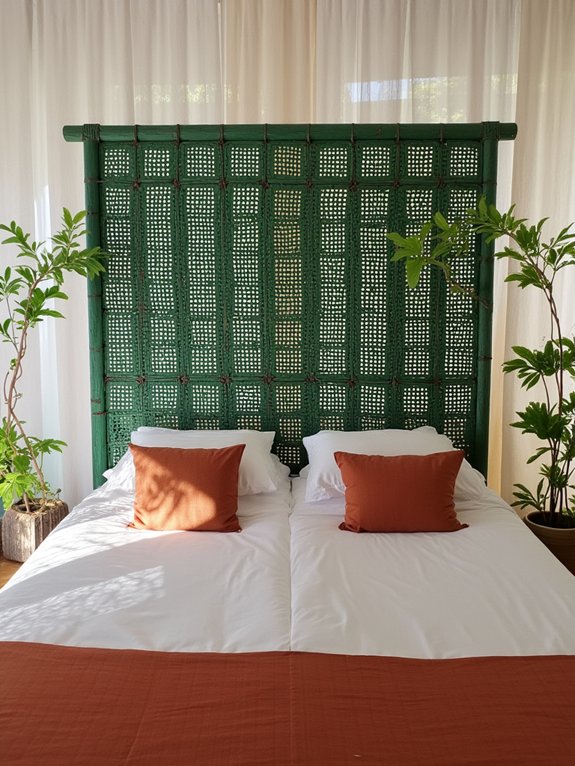 Skilled artisans create stunning headboards by weaving vibrant green bamboo strips in an elegant diagonal pattern. This sustainable piece transforms any bedroom into a serene sanctuary while perfectly complementing terracotta accents throughout the space.