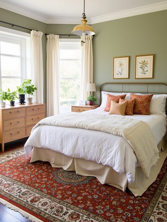A traditional terra-cotta area rug serves as a foundational design element in bedroom spaces, featuring rich earthy tones and geometric patterns inspired by Southwestern aesthetics. The rug’s cultural motifs, including desert flowers, tribal diamonds, and pottery-inspired designs, create visual interest while complementing green wall treatments.