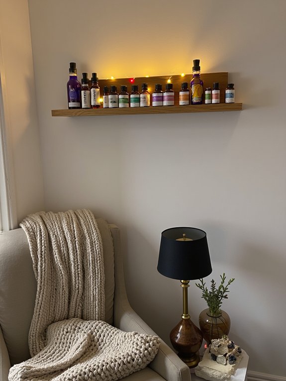 The setup includes a bamboo organizer to store 8-12 essential oil bottles, positioned away from direct sunlight to preserve their potency. A floating shelf mounted above provides additional storage, while a small journal helps track preferred scent combinations. A timer ensures controlled 30-minute aromatherapy sessions for optimal benefits.