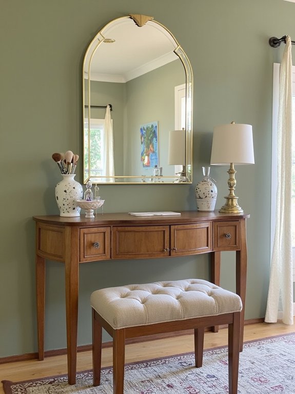 An artisanal vanity station transforms a bedroom corner into a personalized beauty sanctuary. By combining vintage-inspired mirrors, artistic accessories, and practical organization solutions, the space strikes a perfect balance between sophistication and functionality.