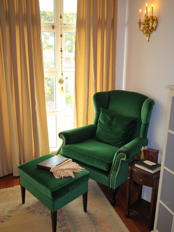 The carefully curated area includes essential prayer elements like a meditation cushion or prayer rug, while the deep-tufted velvet chair in rich jewel tones adds elegance to the room’s décor. The result is a peaceful sanctuary that seamlessly integrates daily devotional practices into the bedroom’s overall aesthetic.