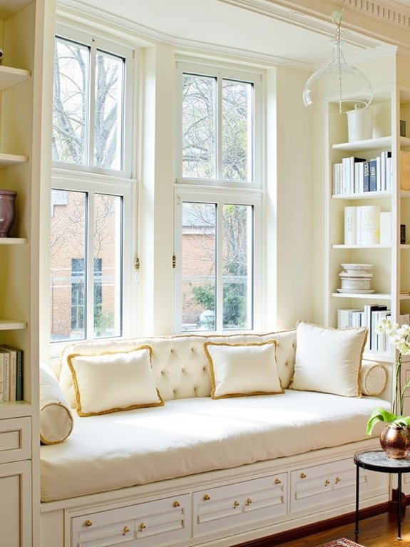 A custom daybed nestled beneath a large window creates an inviting corner sanctuary perfect for reading and relaxation. Measuring 30-36 inches deep and spanning the window width, this luxurious seating features plush memory foam cushioning and an array of decorative pillows in coordinating patterns and textures.