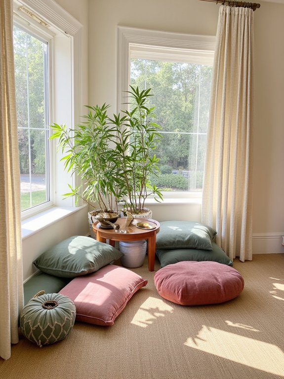 A meditation corner provides a dedicated sanctuary within the bedroom for mindfulness practice and spiritual reflection. By carefully selecting natural fiber cushions and positioning them to face east, the space can facilitate proper meditation posture and energy flow.