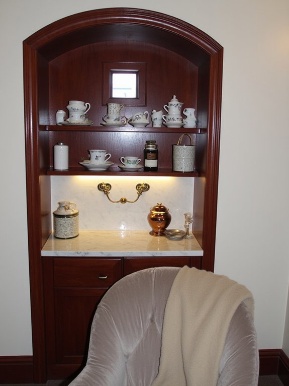 A hidden tea station nook transforms an unused bedroom corner into a dedicated space for mindful morning rituals. By installing a compact sideboard or cabinet, the area houses essential tea-making equipment while maintaining bedroom aesthetics. The setup includes floating shelves for displaying artisanal teas and ceramics, along with a reliable electric kettle with safety features.