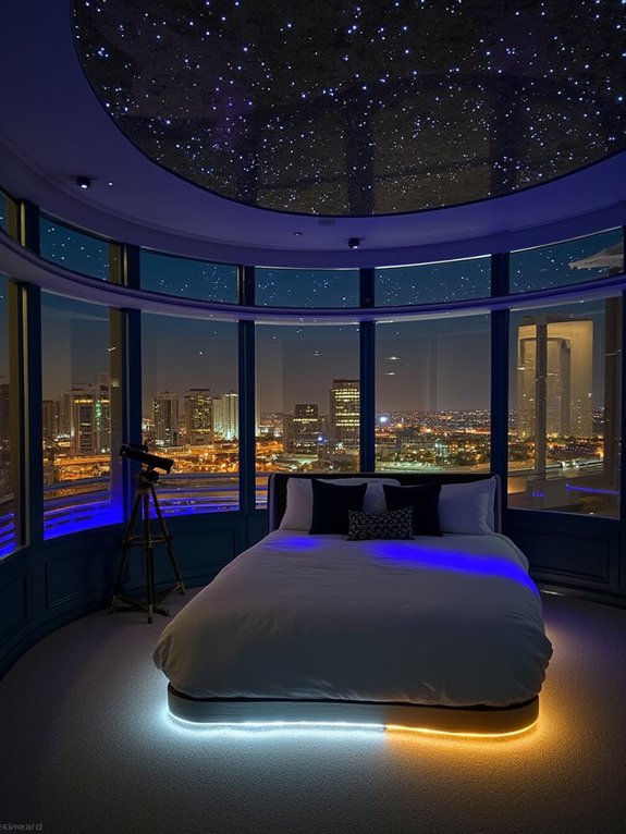 A guest bedroom transformed into a celestial sanctuary features deep navy walls adorned with accurate constellation decals that glow in the dark. The centerpiece is a fiber optic ceiling creating a stunning starlit effect, while a dedicated telescope area near the window enables stargazing. Space-themed bedding in metallic silvers and deep purples enhances the astronomical atmosphere.