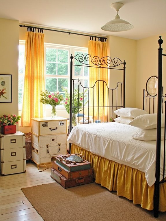A cozy country cottage guest bedroom combines soft, muted colors with vintage accents to create a warm, nostalgic atmosphere. The room centers around a weathered wood headboard, with distressed picture frames, antique dressers, and floral quilted bedding adding authentic charm.