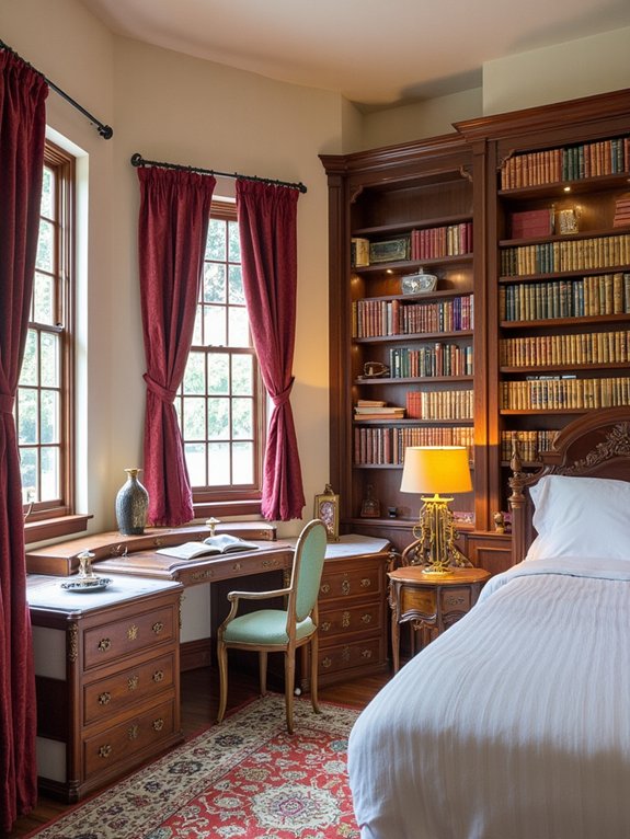 A vintage library bedroom merges cozy sleeping quarters with the refined atmosphere of a classic library. Rich wooden bookshelves line the walls, while leather armchairs and brass reading lamps create intimate reading nooks. The space features carefully selected antique accents like globes, brass bookends, and framed botanical prints.