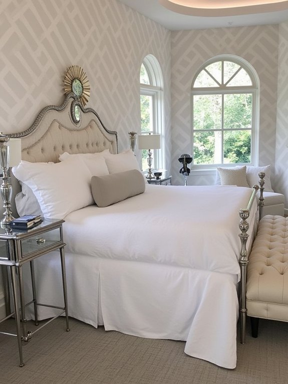 The Art Deco glamour suite embodies the lavish aesthetic of the 1920s and 1930s through geometric patterns, metallic accents, and luxurious materials. Statement furniture with curved lines combines with crystal chandeliers and decorative mirrors to create an atmosphere of sophistication and elegance.