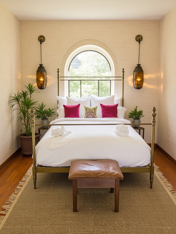 The room’s authentic atmosphere comes to life through carefully layered textures – plush floor cushions invite casual seating while handwoven tapestries bring rich patterns and cultural heritage to the walls. This fusion of Bohemian and Moroccan elements creates an exotic, romantic retreat perfect for unwinding.