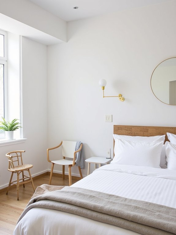 The bedroom’s focal point is a low-profile platform bed in pale oak or birch, complemented by layered white bedding and gray wool throws. Simple floating shelves in matching wood tones provide essential storage while maintaining the room’s minimalist aesthetic, with white walls serving as a serene backdrop.