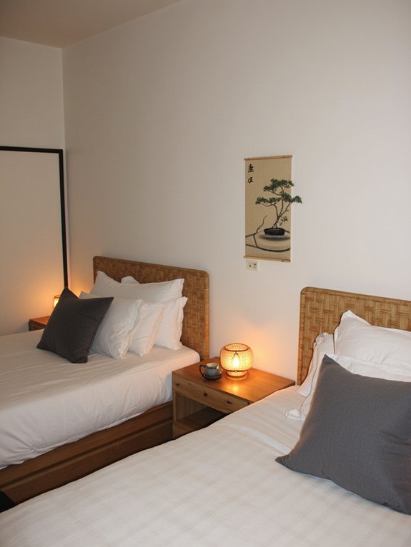 The space centers around key elements including a low-profile dark wood platform bed with crisp white linens, shoji screens that filter natural light, and bamboo accents throughout the room. These thoughtful features work together to establish a peaceful atmosphere that promotes relaxation and contemplation.