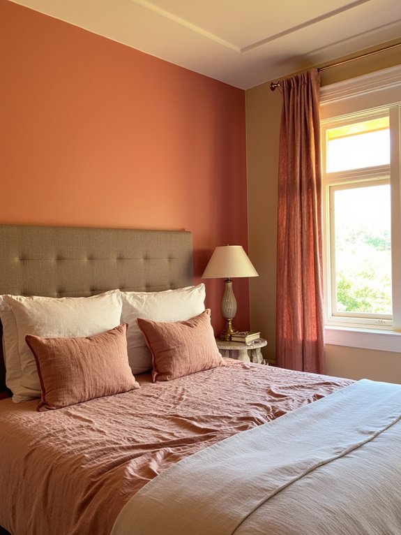 The room’s ambiance is enhanced through carefully chosen accessories and textures. Matte gold or copper lighting fixtures provide a natural glow, while layered bedding in ombrĂ© patterns mirrors the sunset’s gradual color progression. Textural elements like woven throws and velvet pillows in sunset hues complete the organic, peaceful setting.