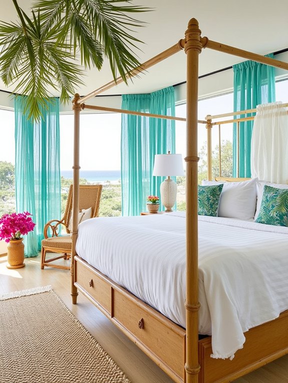 A guest room can be transformed into a peaceful tropical retreat by replacing Art Deco elements with natural island-inspired features. Rattan furniture, bamboo details, and tropical motifs featuring palm fronds and hibiscus patterns create an authentic paradise feel. The calming color scheme incorporates sandy beiges and seafoam greens to enhance the tranquil atmosphere.