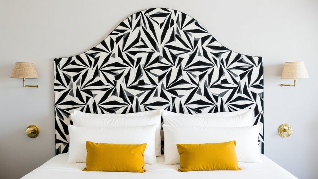 Why not transform your bedroom with a bold graphic headboard that packs a visual punch? You’re instantly adding personality with striking patterns or vibrant colors that demand attention. It’s a quick project—think 4-6 hours over a weekend.