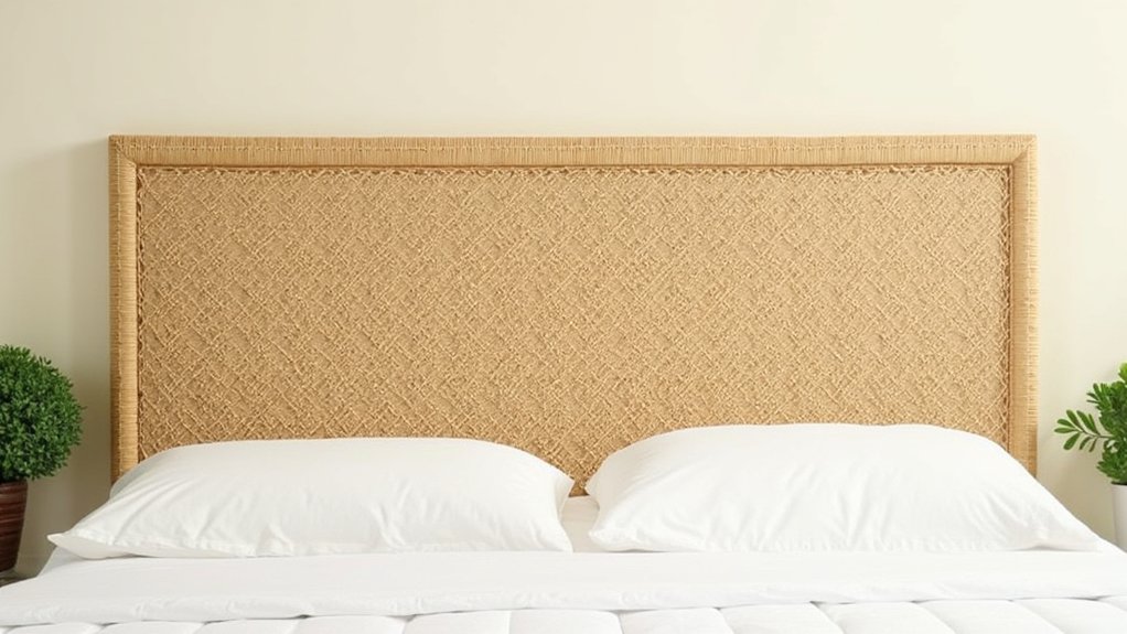 Transform your bedroom with a nature-inspired bamboo headboard that brings earthy charm to your space. You’ll love how it connects you to the outdoors, instantly revitalizing your room’s vibe. Consider a headboard around 60 inches wide and 36 inches tall for a queen bed.