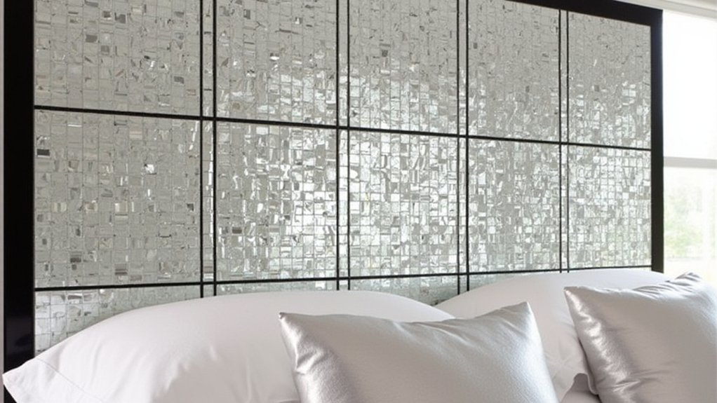While upgrading your bedroom, consider crafting a mirrored mosaic headboard to add a touch of elegance. You’ll create a stunning focal point that reflects light and boosts sophistication. Start with a plywood base, cut to 60 inches wide for a queen bed.