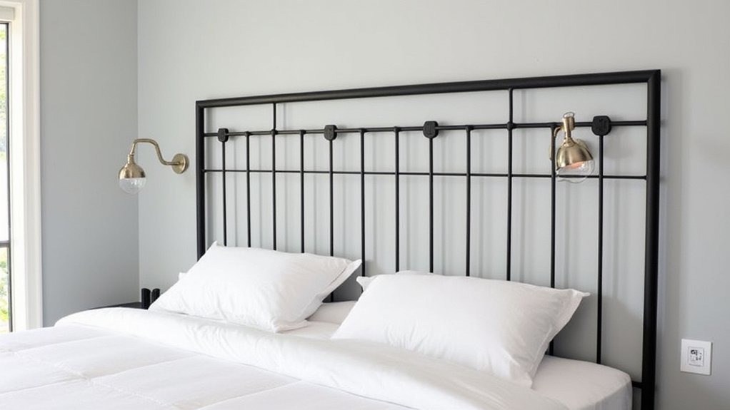 Plunge into the sleek style of a modern metal headboard to transform your bedroom into a contemporary haven. You’re choosing a bold, minimalist look that’s easy to maintain. Pick one around 54 inches tall and 60 inches wide for a queen bed, installable in under an hour.
