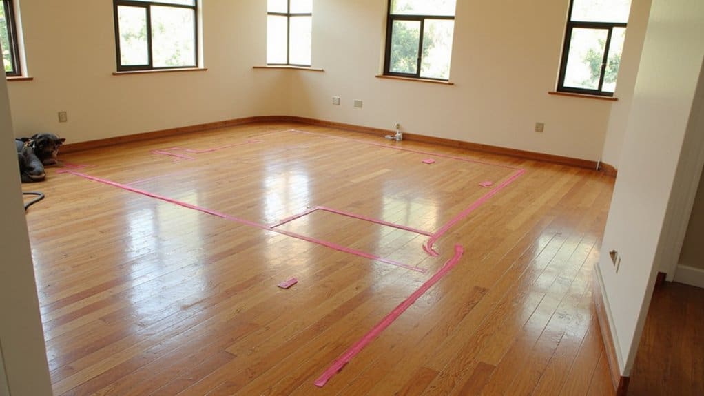 - Grab painter’s tape and mark out rug dimensions, like 8×10 feet for a queen bed, on your floor.