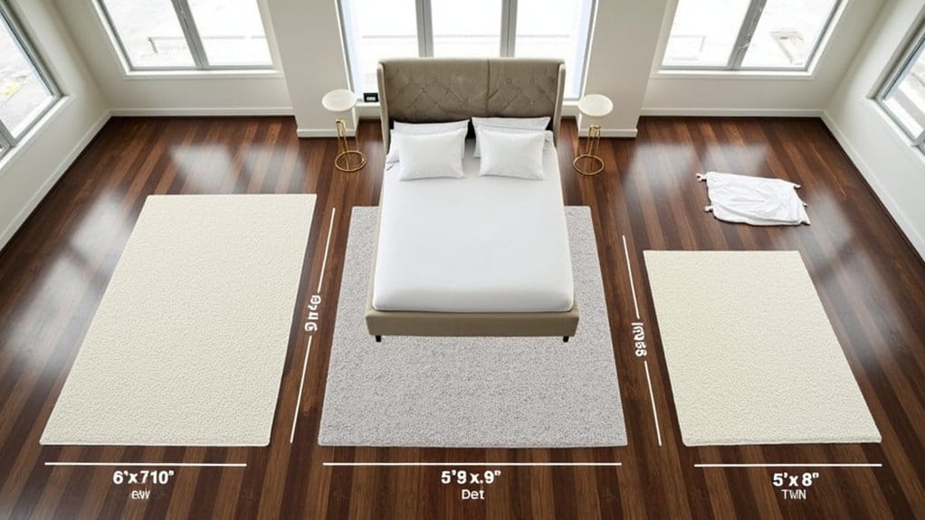 Many homeowners struggle with picturing the right rug size for their bedroom, but you can nail it with a simple trick. Before buying, visualize the rug’s fit with everyday items. This method saves time and guarantees you’re choosing wisely.