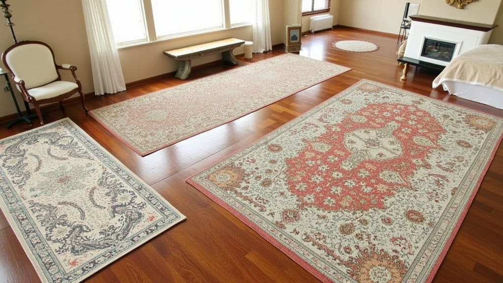 When planning your bedroom rug layout, don’t overlook the importance of foot traffic areas for both comfort and durability. These high-use zones, like around your bed or near the door, need coverage to protect your floors and cushion your feet.