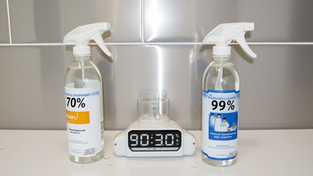 When you’re disinfecting your child’s scraped knee with rubbing alcohol, you might wonder if those few quick dabs are enough to kill harmful bacteria. The truth is, effective disinfection requires specific contact times based on the alcohol concentration you’re using. While a 70% solution needs just 30 seconds for bacteria, tougher pathogens demand longer exposure – and using the wrong timing could leave dangerous microorganisms behind on critical surfaces.