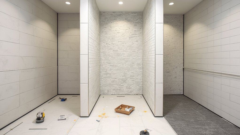 As you tackle tiling in small or irregular bathroom spaces, you’ll notice the job gets trickier due to tight corners and odd shapes. These areas, often under 5 square feet, demand precise cuts and extra patience. You’re likely spending 2-3 hours just measuring around a tiny sink nook or angled wall.