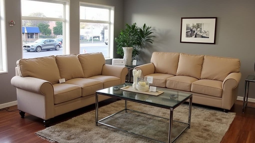 As you begin evaluating the cost of a living room set, it’s critical to assess the value you’re getting for your money. Start by examining durability. Check if the frame uses hardwood, which lasts 15-20 years, guaranteeing long-term use.