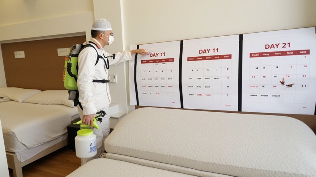 When dealing with bed bug infestations, you’ll need to understand that successful treatment requires multiple spray applications over a specific timeframe. Understanding bed bug biology is essential – these pests have a 21-day egg-to-adult cycle, which directly affects treatment effectiveness.