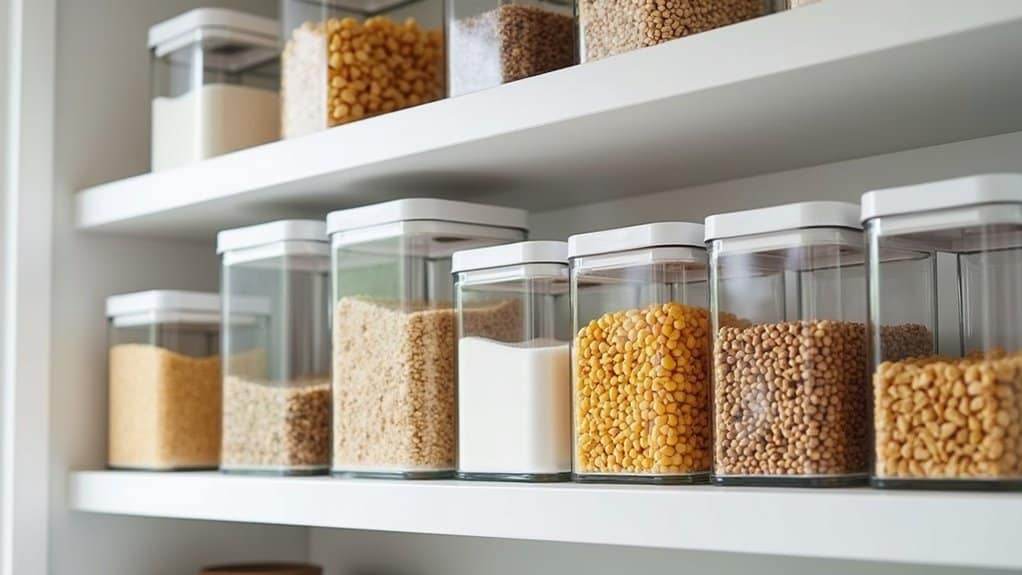 When choosing the right storage containers for your pantry, start by evaluating the types of items you store and their quantities. Opt for clear containers, such as glass jars or plastic bins, to easily see contents and monitor stock levels without opening lids. Make sure the containers are airtight to maintain freshness for dry goods like pasta, rice, and cereals, and select sizes that match your usage patterns to avoid clutter. Finally, consider stackable options to maximize vertical space and keep your shelves tidy.