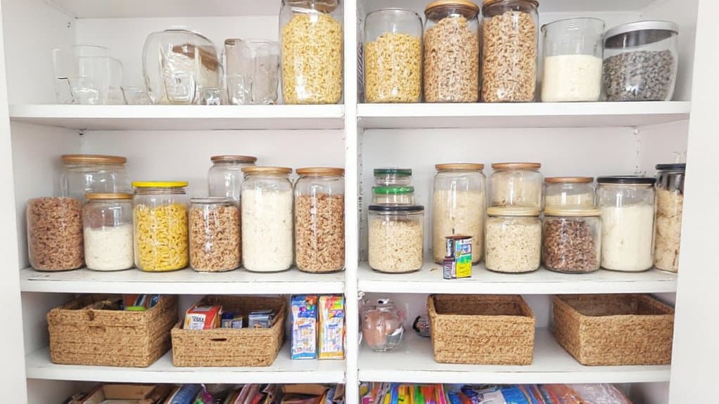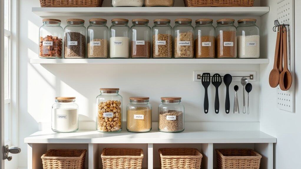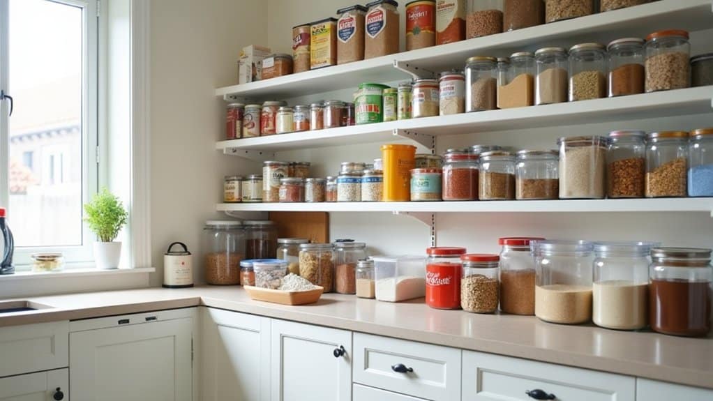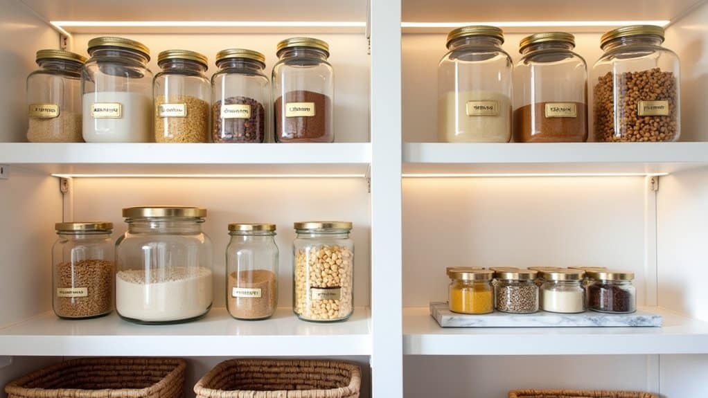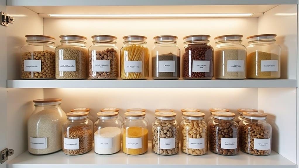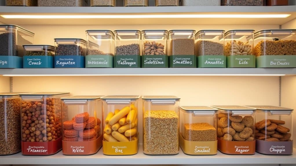 To implement this system effectively, invest in uniform storage containers or labels in your chosen color scheme to create consistency throughout the pantry. Place frequently used items in easily accessible spots, guaranteeing their corresponding color-coded markers are visible. If you’re using clear containers, add colored tags or stickers to differentiate categories without sacrificing visibility of the contents. Finally, share the color-coding rules with household members to guarantee everyone follows the system and keeps the pantry organized.