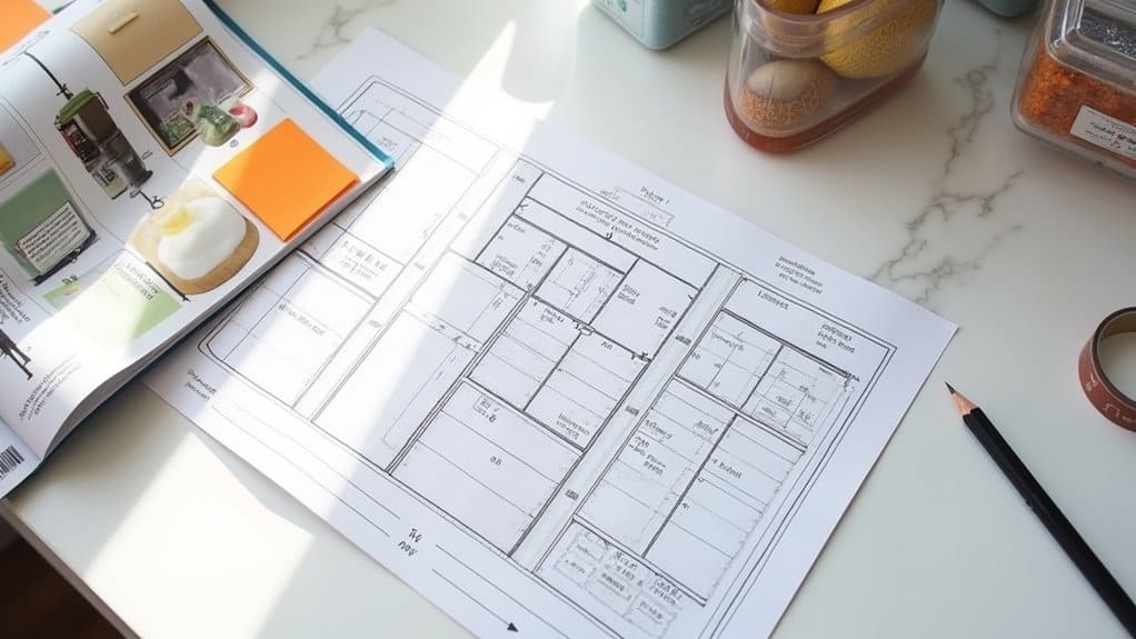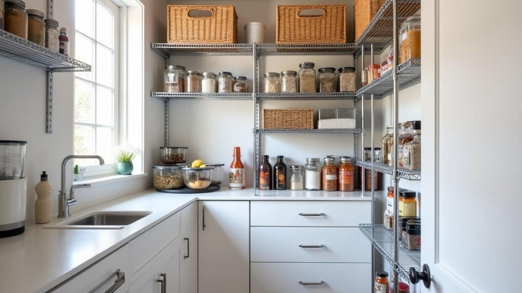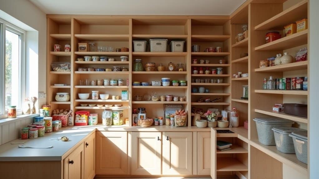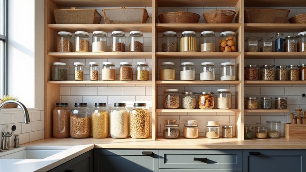 Next, sketch out a rough blueprint of your pantry layout, mapping where each category will go based on accessibility and size of the items. Incorporate storage solutions like clear bins, lazy Susans, and tiered organizers to maximize vertical space and keep everything visible. Verify there’s enough room between shelves for taller items like cereal boxes or bulk containers, and leave some flexibility for future additions. By thoughtfully designing your pantry layout, you’ll create a functional and beautiful space that’s easy to maintain.