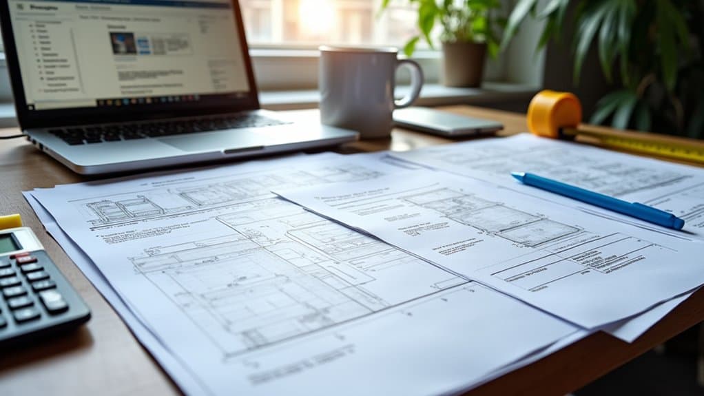 Before you grab a hammer, make certain you secure the necessary permits for your basement bathroom project. Don’t skip this step—it’s critical to avoid fines or delays. Start by contacting your local building department to understand specific requirements, which often include a permit for structural changes.
