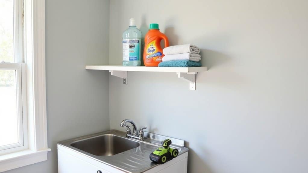 After securing your sink, it’s a smart move to boost your laundry room’s functionality with a utility shelf. This addition offers extra storage without cluttering your space.