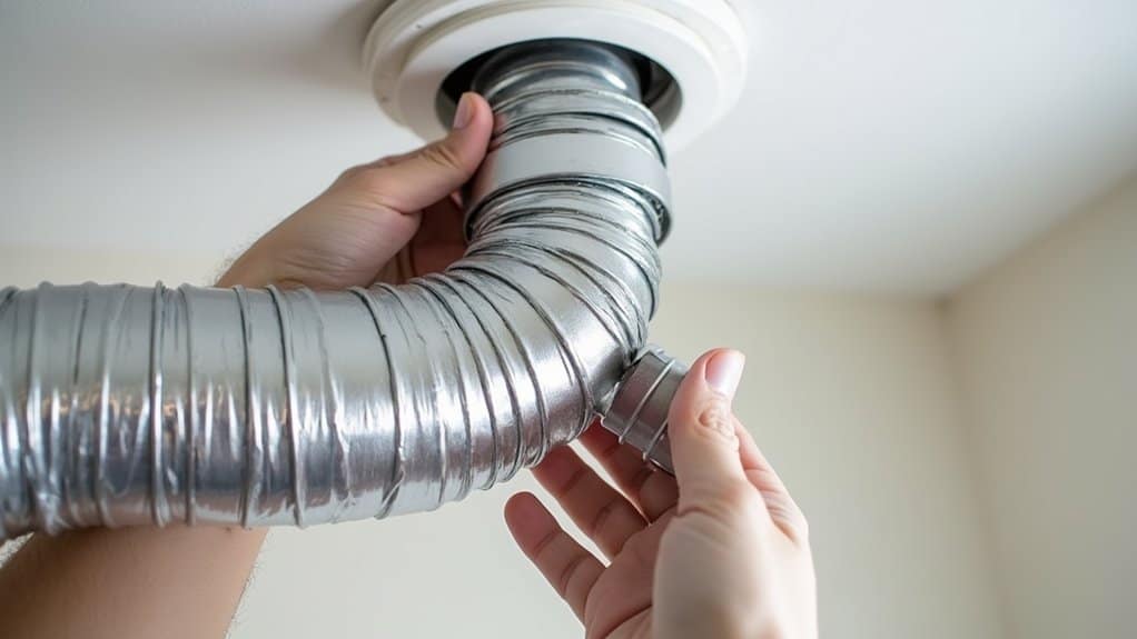 Several key steps await as you tackle connecting the ducting for your bathroom exhaust fan. This process guarantees proper ventilation, so let’s embark with clear steps.