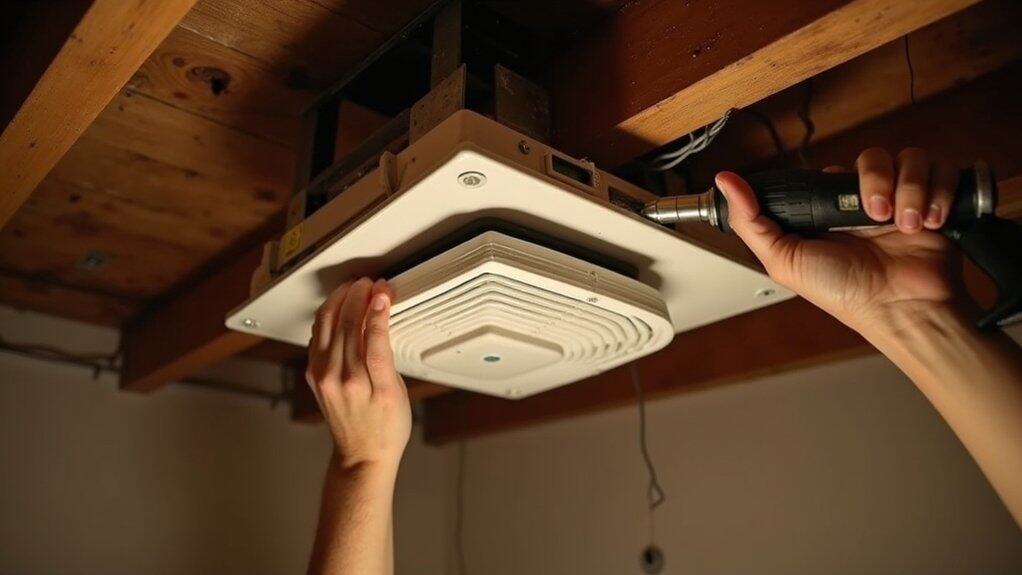 Let’s plunge into mounting the fan housing, a critical step to guarantee your bathroom exhaust fan works properly. This process secures the unit, ensuring it functions well for years. Follow these steps carefully.