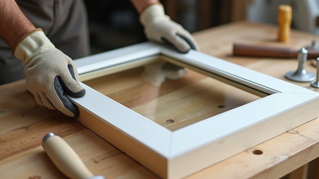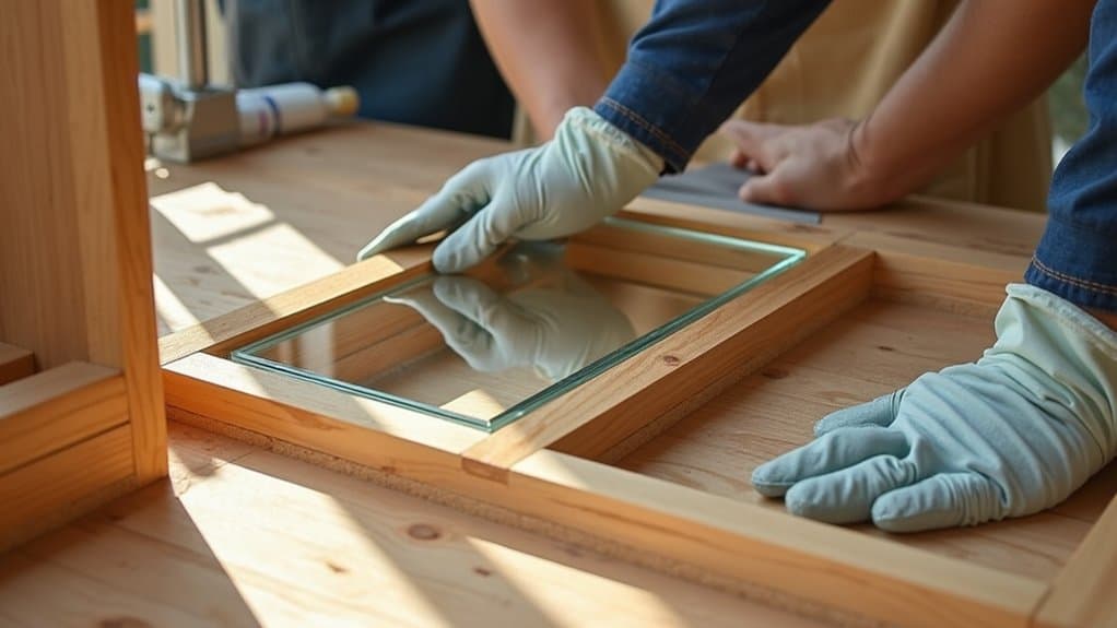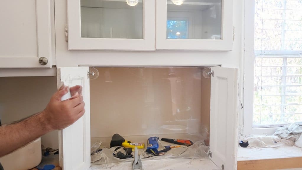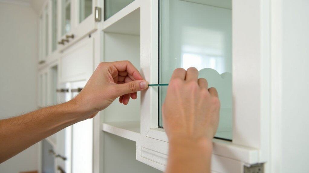 Now that you’ve got your tools ready, let’s walk through adding glass to your kitchen cabinets with clear steps. Start by focusing on key actions like removing cabinet doors, measuring openings with precision (aim for exact dimensions within 1/8 inch), cutting glass panels accurately, securing them in frames, and installing them safely over a 2-3 hour process. As expert carpenter Jane Doe says, “Careful measurement and a steady hand guarantee your glass fits perfectly without risky gaps.”