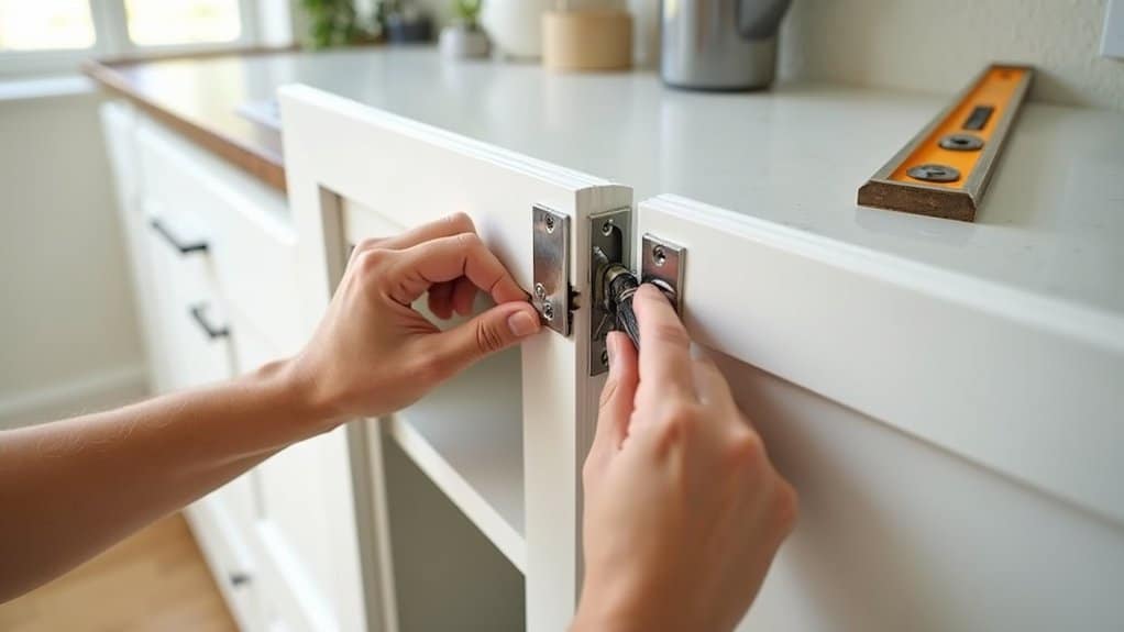Tackle the final step of your kitchen cabinet upgrade by reattaching the doors with precision and care. This guarantees they’re secure and aligned for a polished look. Let’s get started with these steps.