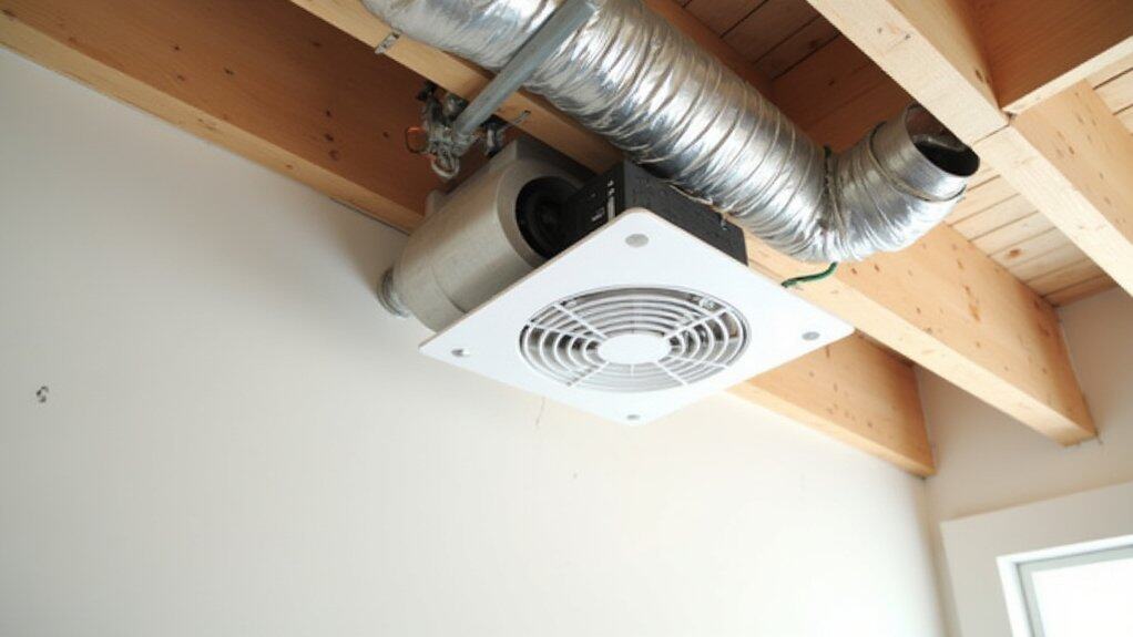 Now that the ductwork’s in place, let’s make sure your bathroom fan runs smoothly by testing its operation. This step’s essential to confirm everything’s working before finishing up.