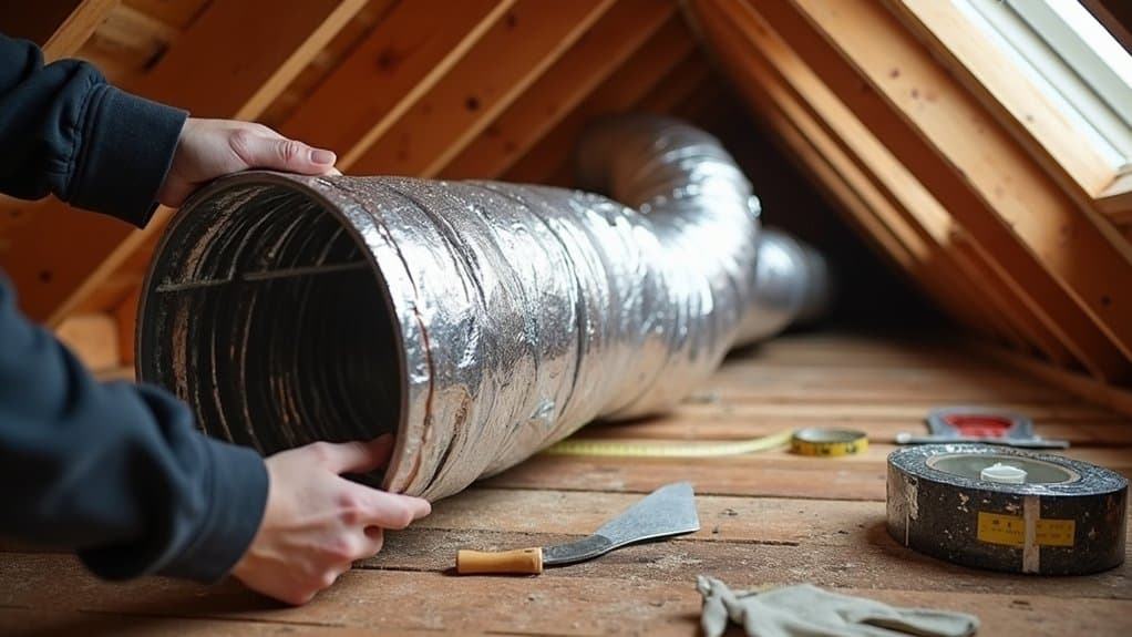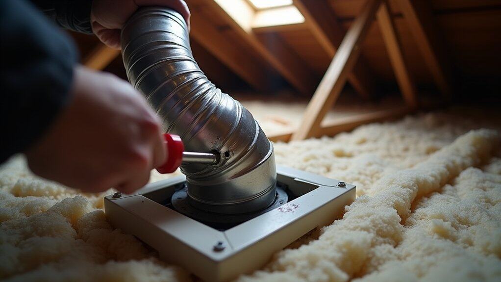 While you’ve got the vent fan mounted, it’s time to tackle the next crucial task of connecting the ductwork securely. This guarantees proper airflow and prevents leaks in your bathroom ventilation system.