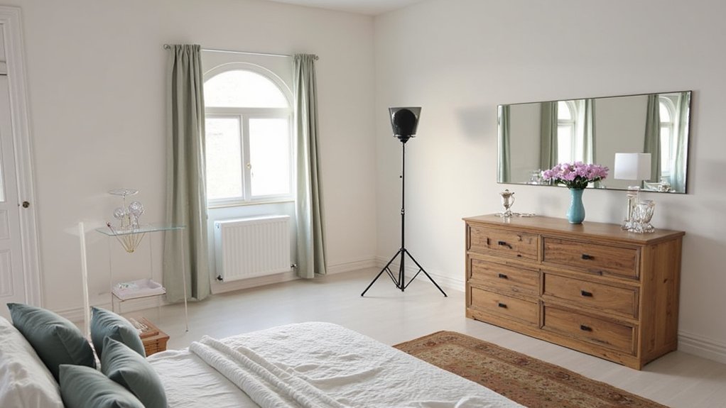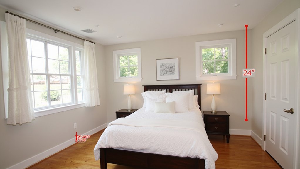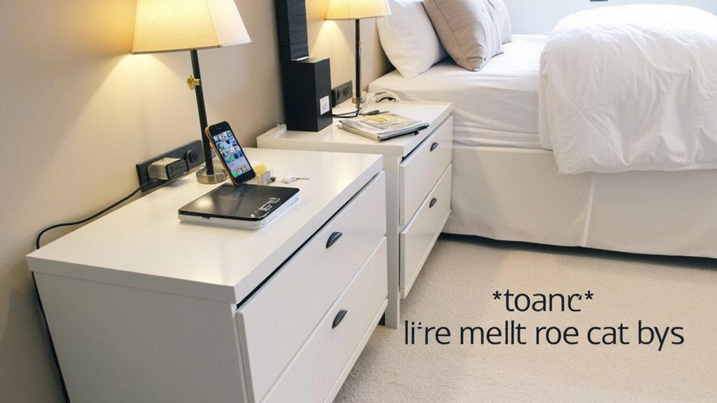 After setting up your bed, let’s focus on getting those nightstands in the perfect spot for function and style. Nightstands aren’t just decor; they’re essential for convenience. Place them within 2-3 inches of your bed’s sides, ensuring the top aligns with your mattress height, around 24-28 inches, for easy access.
