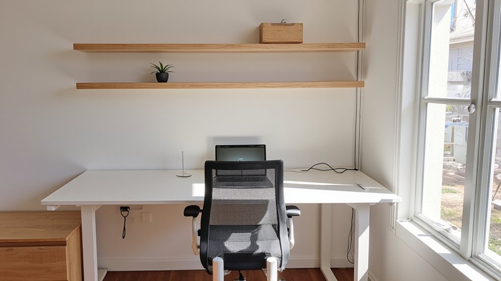 While crafting a functional bedroom, don’t overlook the power of a smart desk setup for work or study. A well-planned desk area can boost focus and fit seamlessly into your space, even if it’s tight. Start by choosing a spot near a window for natural light, ideally a 3×2-foot desk surface.