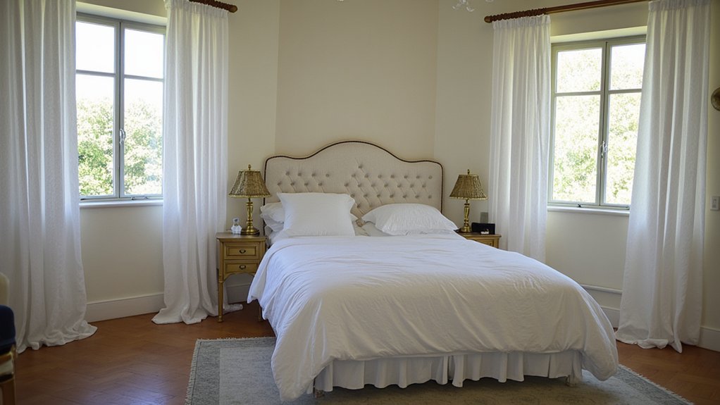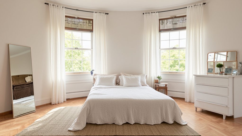 While you’re fine-tuning the look of your bedroom windows, it’s also smart to maximize their practical use for airflow. With two windows, you’ve got a perfect setup for cross-ventilation to keep your room fresh. Position them to create a breeze by opening both windows about 6 inches during cooler hours, like early morning or late evening.