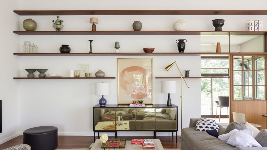 - Install floating shelves at varying heights (36″, 48″, and 60″ from the floor) to display artwork and accessories