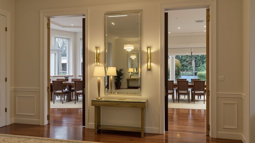 Strategic mirror placement across from windows or entryways doubles your living room’s natural light and creates an illusion of more space. When you’re working with multiple entrances, mirrors become essential tools for expanding sight lines and brightening darker corners.