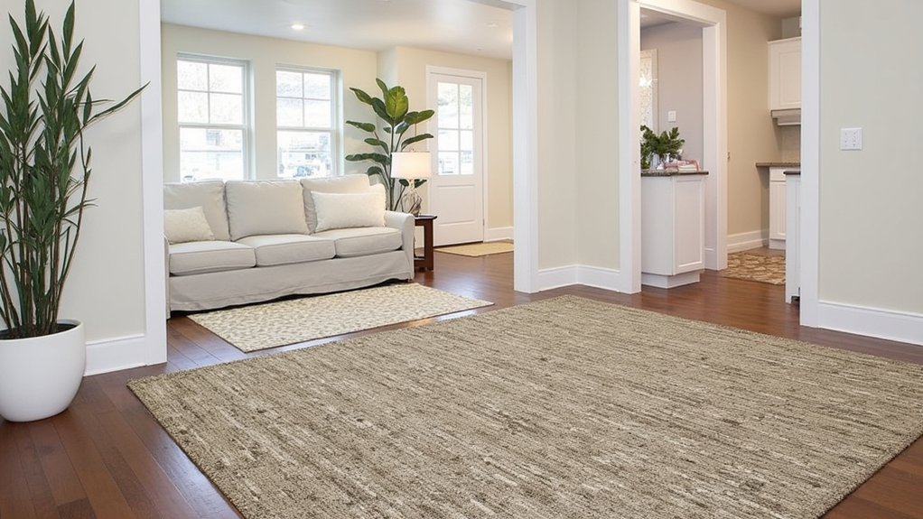 When dealing with two entrances, you’ll want to maintain clear paths while using rugs to establish distinct conversation areas. Use non-slip pads underneath to prevent shifting and guarantee safety.