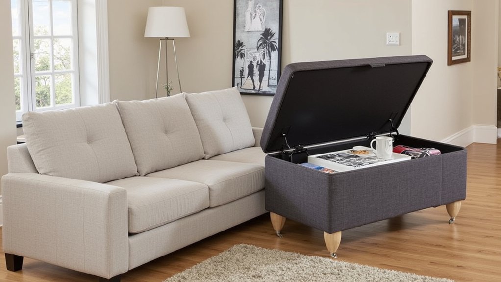 Position your ottoman 18 inches from the sectional’s edge to maintain good traffic flow. You’ll want to guarantee the lid opens completely without hitting walls or furniture pieces.